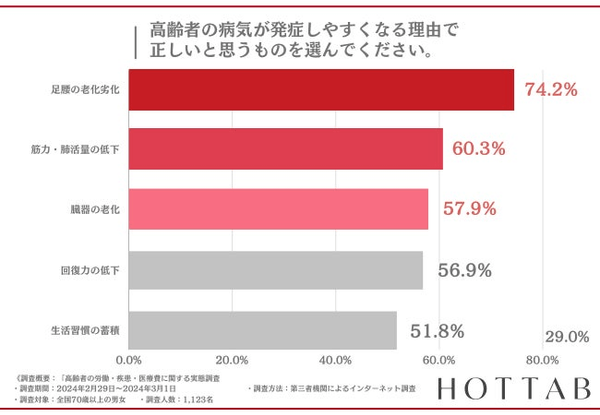 70歳以上の方が自身で感じる、病気発祥の理由については「足腰の老化や劣化」「筋力の低下」など身体的な衰えが一番の原因だと感じているようです。