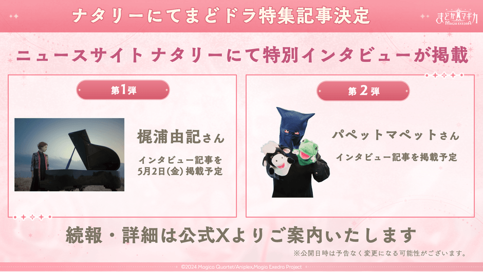 第1弾では主題歌「lighthouse」の作詞・作曲・編曲を手掛けた梶浦由記さん、第2弾ではパペットマペットさんの特別インタビューが掲載されます!続報・詳細は公式X(@madoka_exedra)にてご案内いたします。