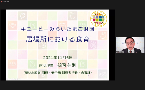 また、農林水産省 消費・安全局 消費者行政・食育課 行政専門員である鶴岡佳則理事から「居場所における食育」と題して講演していただきました。