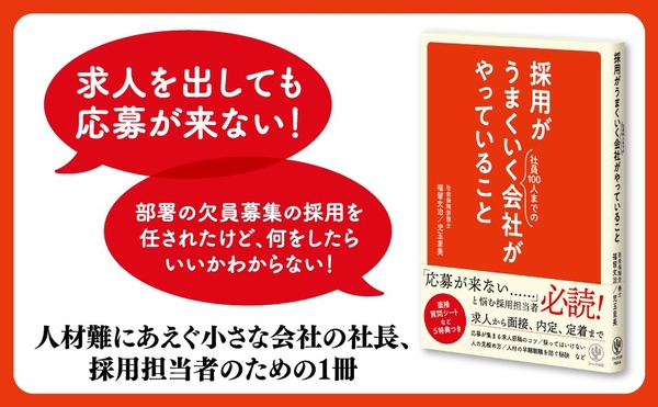 株式会社かんき出版(本社:千代田区 代表取締役社長:齊藤龍男)は、『採用がうまくいく会社がやっていること』(福留 文治、児玉 里美/著)https://kanki-pub.co.jp/pub/book/details/9784761276447を2022年12月21日より全国の書店・オンライン書店等(一部除く)で発売いたします。