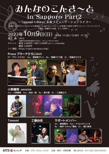 プラーナミュージック主催、『みんなのこんさ~と in Sappro Part2』が2022年10月9日 (日)にSPiCE(北海道札幌市中央区南8条西4丁目422オリエンタルホテルB1F)にて開催されます。