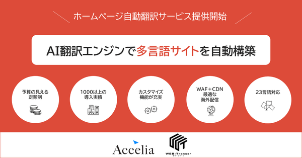 大量データのWebコンテンツ配信プラットフォームを提供するアクセリア株式会社(本社:東京都千代田区、代表取締役社長:牧野 顕道、以下アクセリア)は、ホームページ自動翻訳サービス【WEB-Transer@ホームページ AI】の提供を開始しました。アクセリアではDXソリューションサービスを複数展開しておりますが、AI翻訳エンジンによる自動翻訳サービスを提供することで海外を視野に入れた企業の競争力の向上を支援します。