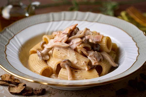 豊かな香りをもつトリュフをふんだんに使用したパスタです。ショートパスタを使用し、ソースが良く絡み食べやすいのも特徴です。まさに五感で楽しむ一品です。