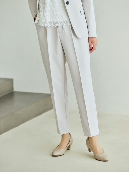 裾に向かって緩やかに細くなるすっきりシルエットのテーパードパンツ。ワンタックで太もも周りには程よくゆとりをもたせています。