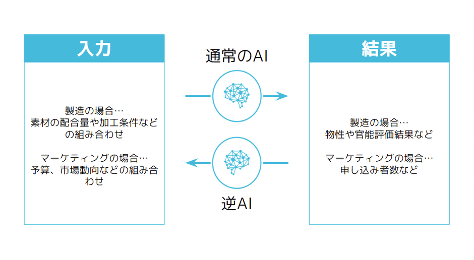 この逆AIを用いることにより、例えば、製造業における研究開発の工数を大幅に削減し、効率的な新製品の開発を行うことが可能となります。また、製造業以外の業種においても、予算や計画の策定など、特定の条件下で最適な設定を見つけたいという場合において、活用することができます。