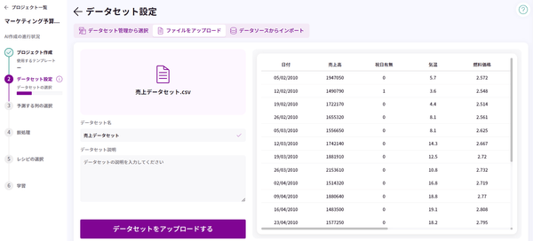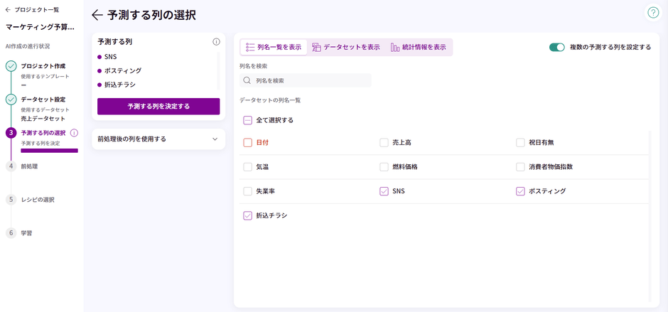 ここでは、予測したい対象(素材の配合量や加工条件など)を選択します。