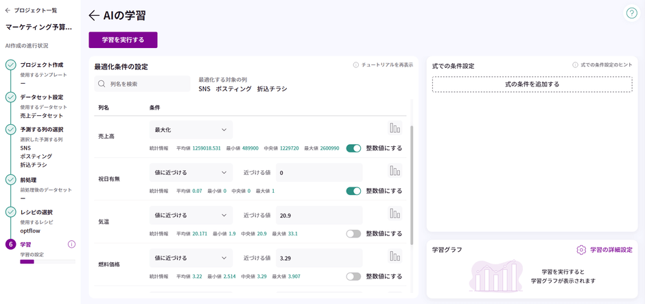 AIを学習する際の条件を設定します。この時、各変数を、最大化する、最小化する、特定の値に近づける、など複数の選択肢から選ぶことができます。また変数の間に関係性があるときは、その条件を式で入力することもできます。