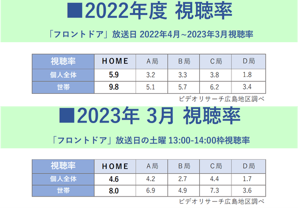 2023年3月の月間平均は<個人全体視聴率4.6%・世帯視聴率8.0%>いずれも同時間帯1位で、12カ月連続トップを継続中です。(ビデオリサーチ調べ、広島地区)