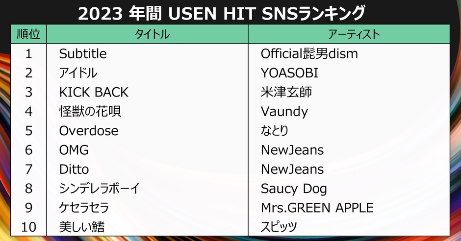 3位の米津玄師『KICK BACK』、9位のMrs.GREEN APPLE『ケセラセラ』、10位のスピッツ『美しい鰭』など、TOP10にはアニメやドラマの主題歌が多くランクインし、6位と7位はK-POPガールズグループ、NewJeans『OMG』、『Ditto』が並んでランクイン。活躍目覚ましい若いアーティストのロングヒット曲が名を連ねるランキングでした。