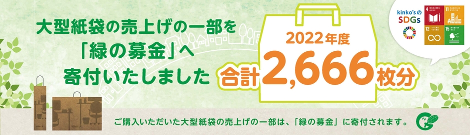 当社では、サステイナブルな社会の実現に貢献するため、ポスターやパネルの持ち運びに便利な大型の紙袋を店頭で販売し、その収益金の一部を紙の原料となる森林資源を循環させ、森林づくりを推進する『緑の募金』へ寄付する取り組みを2021年より開始しました。