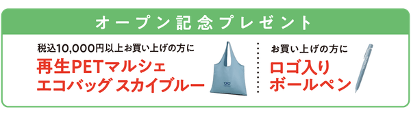 オープンを記念し、期間中お買い上げの方に「オリジナル ボールペン」を、さらに税込10,000円以上お買い上げの方には「再生PETマルシェ エコバッグ」をプレゼント!
