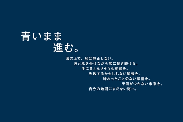「青」は誠実さや信頼、品格、そして知性を象徴するだけでなく、青春や若葉といった若さや未来をも連想させる色です。シップスは設立以来、変わらぬ想いや姿勢を抱きながら、50年の歴史の中で常に新しい可能性を求めて航海を続けてまいりました。これから先も、シップスを支えてくださるすべての人々と共に、未知なる未来へと挑戦を続けてまいります。その想いを「青いまま進む。」というステートメントに込めています。