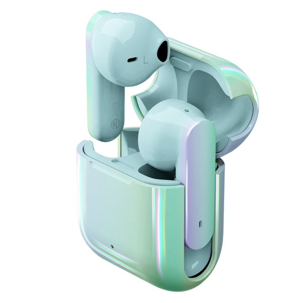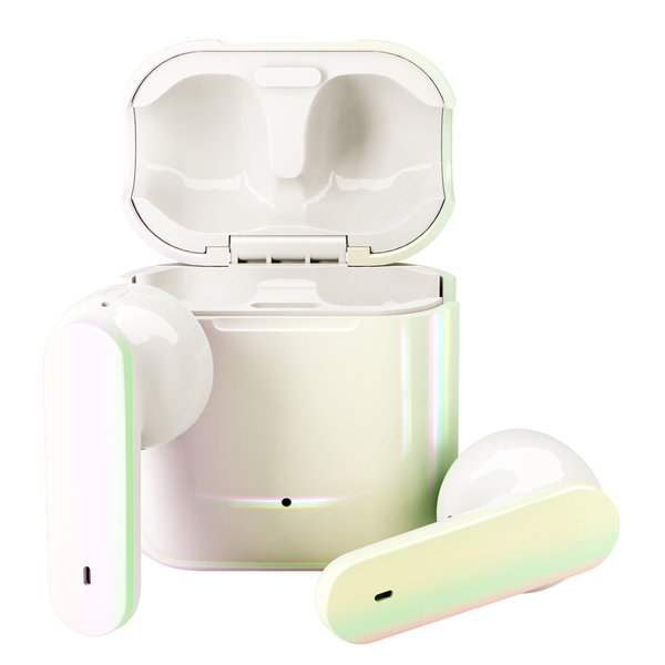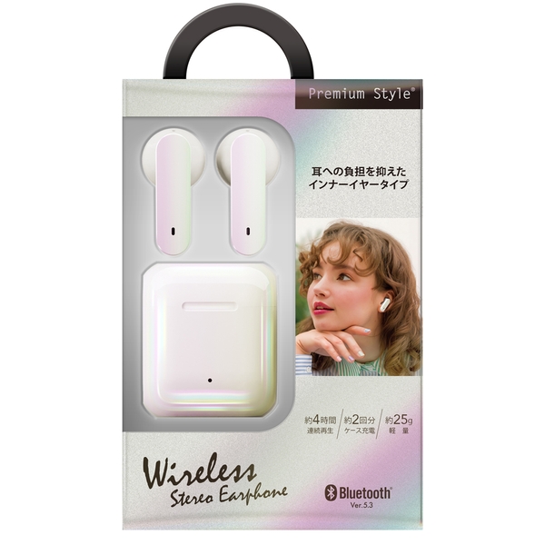 オーロラ加工を施した煌びやかなデザインの完全ワイヤレス ステレオイヤホン インナーイヤータイプです。省電力、高速通信のBluetooth® 5.3を搭載しています。イヤホン本体は簡単に着脱でき、密着する違和感や長時間での疲労感を感じにくいインナーイヤータイプです。充電ケースは高さ39mmのコンパクトサイズで、イヤホン本体を収納しても約25gと軽く、持ち運びにも邪魔になりません。充電ケースはイヤホン本体を約2回フル充電できます。