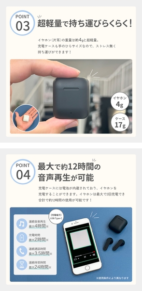 約4時間連続再生/約2回分ケース充電/約25g軽量