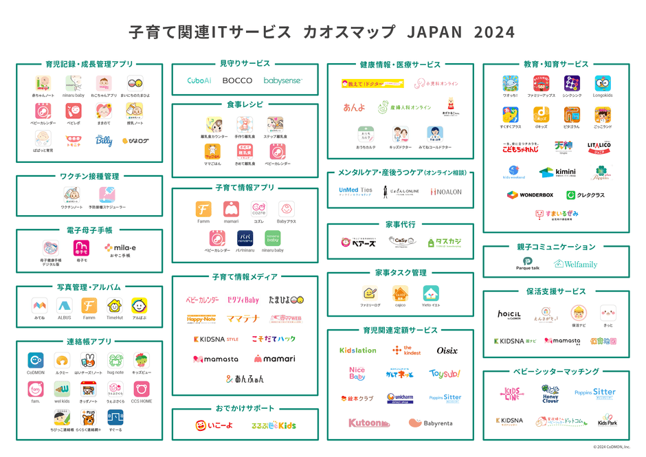 株式会社コドモン(本社:東京都港区、代表取締役:小池義則)は、日本国内における主要な子育て関連のITサービスを19分野に分類し、110の製品・サービスにとりまとめ、「子育て関連ITサービス カオスマップ JAPAN 2024」として今回初めて作成・公開いたしました。