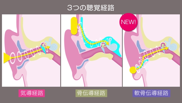 「軟骨伝導」は「骨伝導」の一種であるかのように誤解されがちですが、その聞こえのメカニズムや音伝達の性質、特徴は「骨伝導」とは全く異なります。2004年に奈良県立医科大学 理事長・学長の細井裕司先生が発見した軟骨伝導は、これまでに知れ渡っていた空気を震わせて音を伝える「気導」と、骨を震わせて音を伝える「骨導」とは別の経路となる第3の聴覚です。