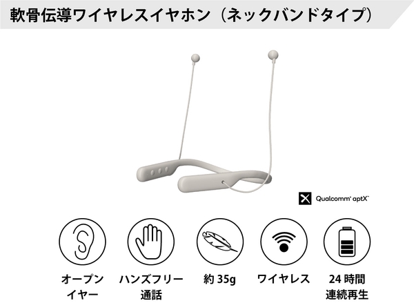 耳のくぼみにいれたイヤホン本体の振動が耳穴内部の軟骨に伝わり、そこで生まれた空気の振動が鼓膜に届くという、新しい経路となっています。 同時に軟骨伝導方式は、イヤホン本体が生んだ音波が直接鼓膜に届く、軟骨から頭蓋骨に伝わった振動が蝸牛に伝わるといった特性ももちます。 実は従来のイヤホンと骨伝導イヤホンの利点を兼ね備えています。