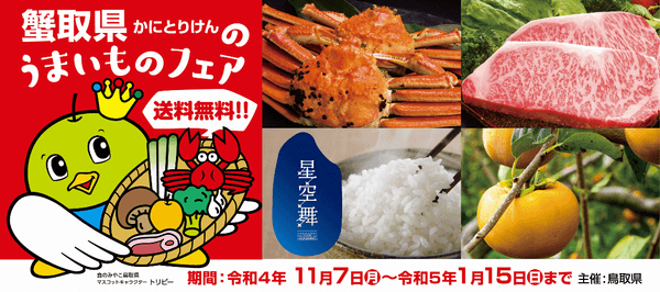 新型コロナウイルス感染拡大により県内外での販売の制約が続く中、県内事業者の厳しい販売状況を踏まえ、県産品の販路拡大を目的に、県産品を広く取り扱う一般社団法人鳥取県物産協会と連携し、鳥取県を代表する松葉がになど産直商品を揃えた「蟹取県のうまいものフェア」を開催中です。