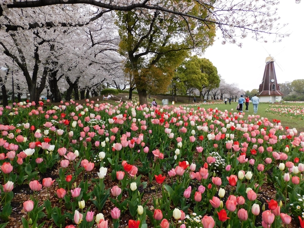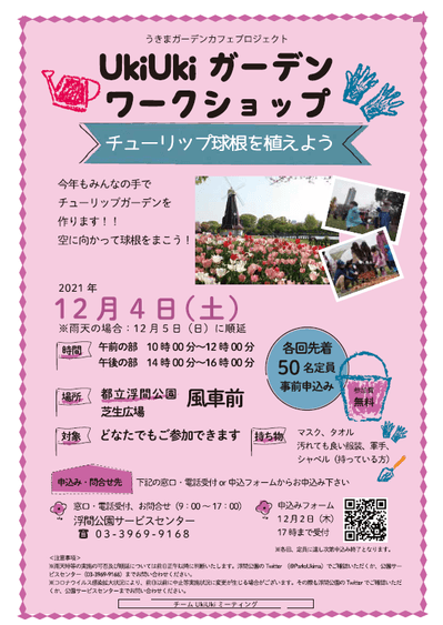 昨年度に引き続き、都立浮間公園に1万本のチューリップの球根を皆様と一緒に植えるイベントを開催いたします。今年度は風車のある芝生広場の斜面に造成中の花壇、「UkiUkiガーデン」を中心に植付を行います。
