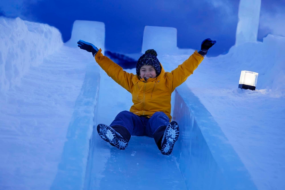 アイスヴィレッジには街全体を見渡せる展望台があります。そこから街へと滑りおりていく氷の滑り台、その先にはアイスリンクが広がります。どちらも子どもから大人まで楽しめる人気のアクティビティです。自然の寒さが作り上げたアイスリンクでは、幻想的な景色を眺めながらスケートを楽しめます。スケート靴は貸し出しを行っているので誰でも気軽に体験できます。