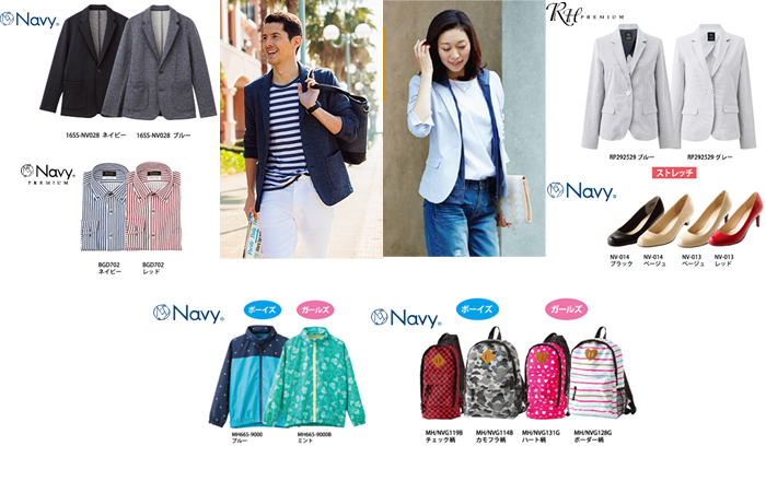 メンズは、プライベートブランド「Navy(R)」のアップブランド「Navy(R) PREMIUM(ネイビープレミアム)」より、ドビーストライプシャツをお勧めします。鮮やかなストライプが引き締まった印象をあたえ、動きやすいナチュラルストレッチ仕上げのデザインシャツです。ウィメンズは、プライベートブランド「RUSH HOUR」のアップブランド「RUSH HOUR PREMIUM(ラッシュアワープレミアム)」から、ストライプジャケットをお勧め。