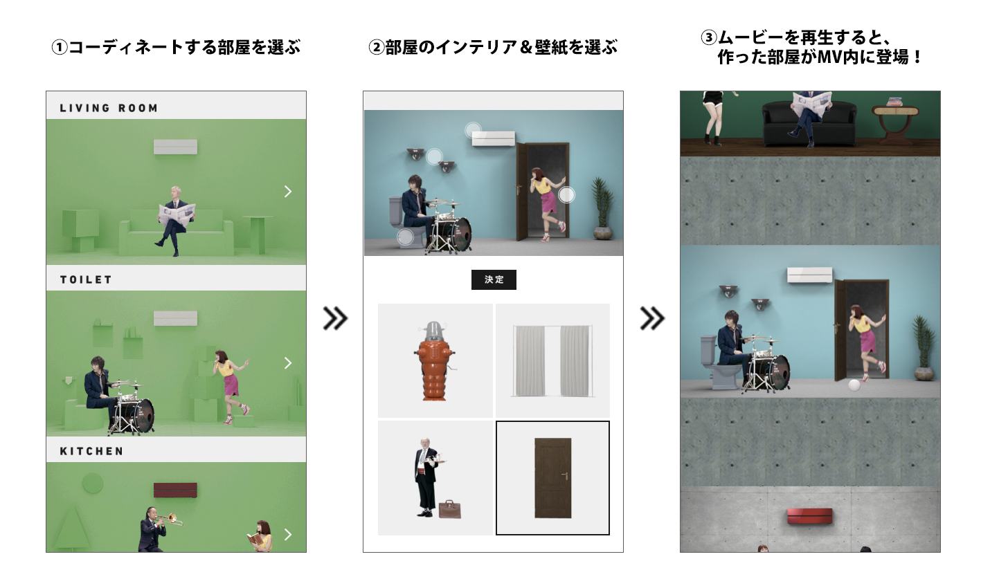 東京スカパラダイスオーケストラのメンバーが演奏する部屋から好きな1部屋を選び、あなたのセンスで壁紙や家具を選んでインテリアをコーディネートすると、その部屋でメンバーが演奏するミュージックビデオがその場で完成!そのまま再生&シェアできます。あなたのこだわりのコーディネート次第で、部屋もストーリーも変化するスカパラの新曲ミュージックビデオに参加しましょう! 注)スマートフォンのみ対応となります。(iOS9以上・Android5以上での再生を推奨致します。通信料はお客様負担となります。)
