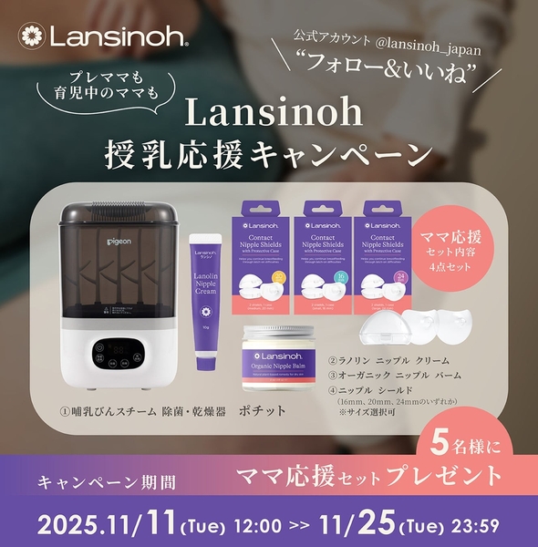 ピジョン株式会社(本社:東京、社長:矢野 亮)が展開する米国発の母乳育児サポートブランド「Lansinoh®(ランシノ)」は、日本国内での本格上陸第1弾として、7種の天然植物由来の保湿成分を配合した「オーガニックニップルバーム」(乳頭クリーム)および「ニップルシールド」(乳頭保護器)を新発売。2025年11月14日(金)より、一部オンラインストア及び、一部ベビー用品専門店などで順次販売いたします。また、発売を記念し、抽選で5名様に本商品が当たるキャンペーンを開催いたします。