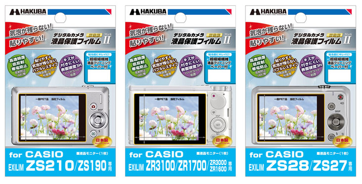 ハクバ写真産業株式会社 (本社:東京都墨田区)は、バブルレスタイプのデジタルカメラ用液晶保護フィルムに、新発売の「CASIO EXILIM ZS210」用、「CASIO EXILIM ZR3100」用、「CASIO EXILIM ZS28」用の3製品を追加いたします。