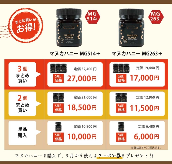 概要:天然の抗菌物質「メチルグリオキサール(MGO)」を多く含むニュージーランド産マヌカハニーが対象のセールを開催。単品購入~3個まとめ買いまで、お得に購入可能です。