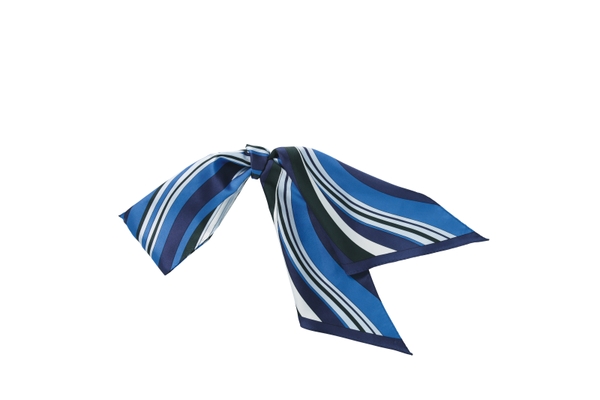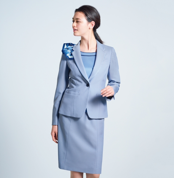 ブルーのジャケットとネイビーのワンピース、スカーフがアクセントとなる、さわやかな印象のスタイル。