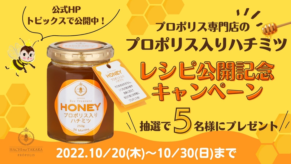 プロポリス入りハチミツレシピ公開を記念して、twitterにてプロポリス入りハチミツを抽選で5名様にプレゼント。