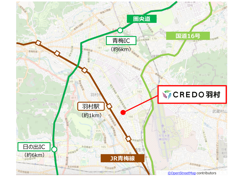 同施設は、首都圏中央連絡自動車道(以下、圏央道)「青梅IC」より約6km、JR東日本 青梅線「羽村駅」より約1kmに位置しています。圏央道経由で東名高速道路や中央自動車道、関越自動車道へのアクセスにも優れ、広域配送拠点として利用できるほか、国道16号に近接し、関東西部への配送拠点として活用が可能です。また、「羽村駅」から徒歩圏内かつ、近隣には住宅地が広がっており、雇用面においても優れています。製造企業が集積し、機械、電子部品などを扱う企業が数多くある、西多摩エリアの東京都羽村市に立地し、同エリアにおいて希少な、一社での占有利用が可能な物流施設です。
