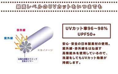 糸にチタンを練り込んだ高機能素材を使用。何度洗濯してもUVカット効果が持続します(UVカット率98%以上、UPF50+)。また、吸汗速乾性も併せ持っているので、いつもさらりとして着け心地がよく、やわらかなストレッチ性が着用ストレスを減らし、活動時の快適性を保ちます。