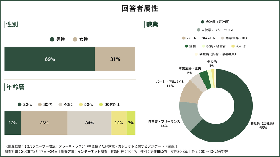 ・有効回答:104名(性別:男性69.2%・女性30.8% / 年代:30〜40代が約7割)