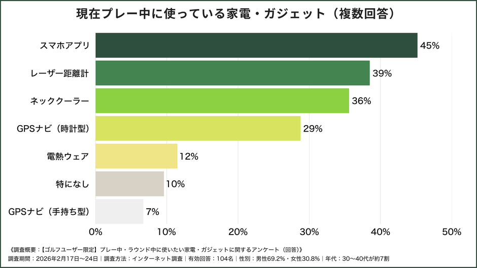 「現在プレー中に使っている家電・ガジェット」を複数回答で聞いたところ、ネッククーラーが35.6%(3位)に入り、GPSナビ時計型(28.8%)を上回りました。電熱ウェアも11.5%が使用中です。