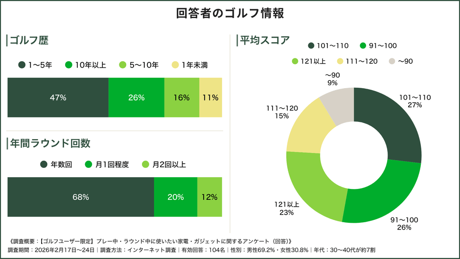 ・回答者の約7割が30〜40代、ゴルフ歴1〜5年が47%とカジュアル〜中級層が中心