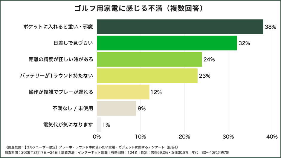 ・現在の不満1位「ポケットで重い・邪魔(37.5%)」2位「バッテリーが1ラウンド持たない(23.1%)」