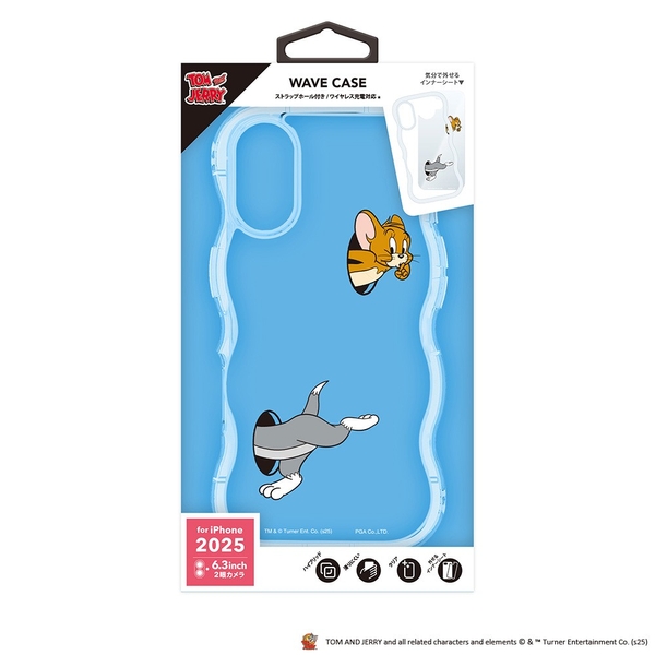 「トムとジェリー」デザインの着せ替えシートがセットになったiPhone用 ウェーブケースです。iPhone本体の色を活かす透明タイプの着せ替えシートは気分に合わせて取り外しが可能です。波打つデザインが可愛らしいウェーブケースは、耐久性のあるポリカーボネイトとしなやかなTPUを組み合わせたハイブリッド設計で端末本体をしっかり保護します。ケースを付けたままワイヤレス充電が可能です。お手持ちのストラップをつけて落下を防げるストラップホール付き。