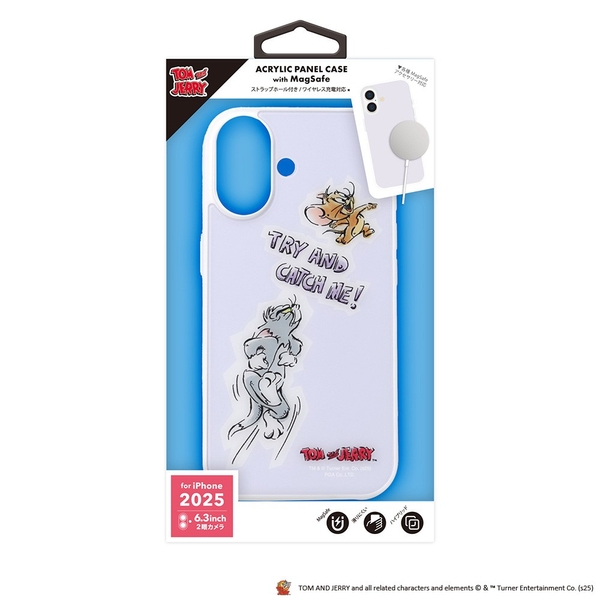 「トムとジェリー」デザインの各種MagSafeアクセサリーに対応したiPhone用 アクリルパネルケースです。背面は美しい光沢でデザインを活かすアクリル素材を使用し、側面はキズや衝撃にも強いTPU素材を使用しています。マグネットリング搭載で各種MagSafeアクセサリーをピタッと簡単装着できます。お手持ちのストラップをつけて落下を防げるストラップホール付き。