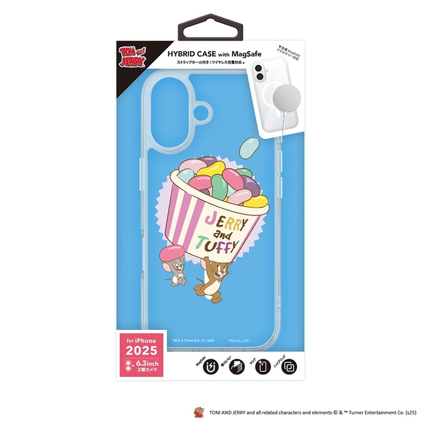 「トムとジェリー」デザインの各種MagSafeアクセサリーに対応したハイブリッドケースです。MagSafeアクセサリーをピタッと簡単装着。背面は衝撃に強いポリカーボネイト・側面は手に馴染みやすいTPUを組み合わせたハイブリッド設計で端末本体をしっかり保護します。お手持ちのストラップを付けて落下を防止できるストラップホール付き。