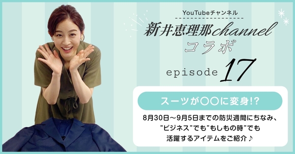 毎回ファッションをテーマとした楽しいコンテンツが話題の「新井恵理那channel」とのコラボ企画。今回のエピソード17では、日常時だけでなく非常時にも活用できるフェーズフリーなアイテムとして販売する「エコバッグジャケット」と「ネックピロージャケット」について紹介します。裏地に取り付けた専用袋に上着そのものを収納することで、バッグや首枕(ネックピロー)に早変わりする「洋服の青山」オリジナルの“変形ジャケット”で、ビジネスシーンでのちょっとした便利グッズとして人気がある他、“もしもの時”にも役に立つ商品としても提案しています。