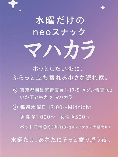 中目黒「モデル風の美人ママのお店」 「水曜だけのnoeスナック マハカラ」オープン