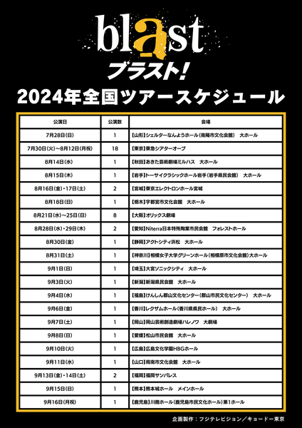 今夏10年ぶりに来日する『blast ブラスト!』(企画製作:フジテレビジョン/キョードー東京)の全国ツアースケジュールが決定いたしました。7月28日(日)から9月16日(月祝)の約1ヶ月半をかけて全国21会場をめぐります。なお、2月10日(土)10:00から、全公演対象の最速先行販売(先着)をチケットぴあにて開始いたします。