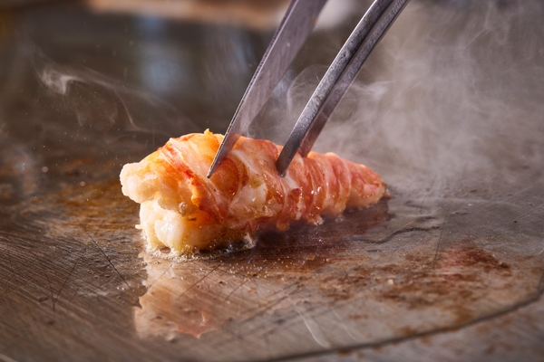 目の前で調理を行うライブキッチンでは、香ばしい香りと音、出来たての美味しさをその場で楽しめる鉄板焼き料理をご提供いたします。ディナーの鉄板焼きコースで使用する厚さ5センチ、長さ1メートルの本格鉄板を使い、シェフがお客様の目の前で焼き上げます。