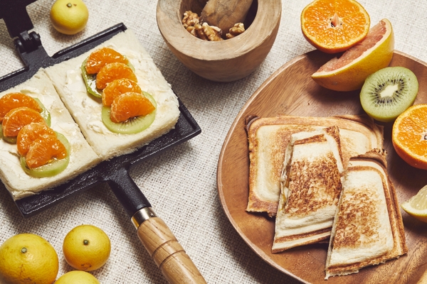 みかんとクリームチーズをパンで挟み、ホットサンドを作ります。クリームチーズの塩気がみかんの甘みを引き立たせる一品です。