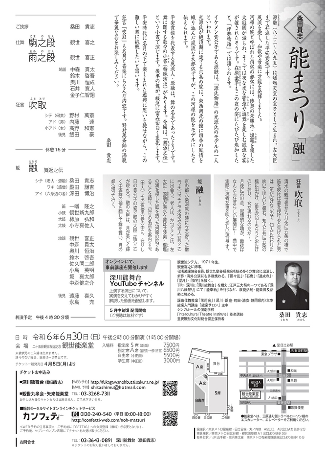深川能舞台主催、桑田貴志「能まつり『融』」 が2024年6月30日 (日)に二十五世観世左近記念観世能楽堂(東京都 中央区 銀座 6-10-1)にて上演されます。