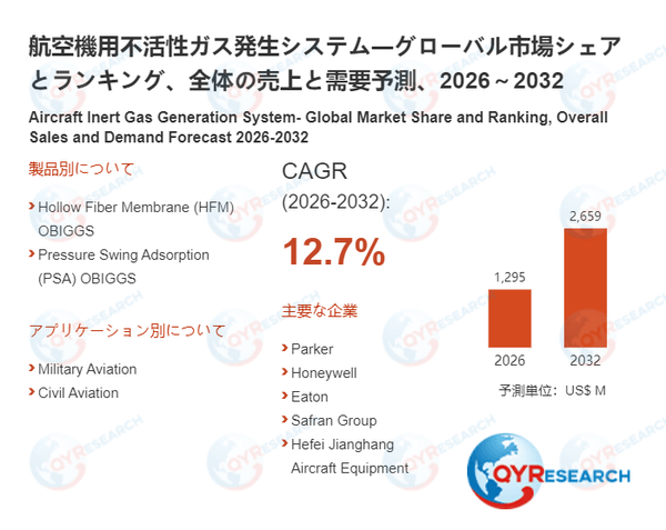 QYResearchが発表した新たな市場調査レポート「航空機用不活性ガス発生システム―グローバル市場シェアとランキング、全体の売上と需要予測、2026~2032」によると、世界の航空機用不活性ガス発生システム市場規模は2024年の約1162百万米ドルから2025年の1295百万米ドルへと順調に拡大すると見込まれ、予測期間中は年平均成長率(CAGR)12.7%で成長し、2031年には2659百万米ドルに達すると予測されている。