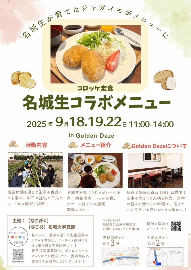 飲食店と生産者を結び付け、フードロス削減のコミュニティーづくりを目指している本学の学生団体「【なごがく】名城大学支部」が、農学部附属農場(春日井キャンパス)で栽培したジャガイモを使ったコロッケ定食を、9月18、19、22日の3日間、天白キャンパス正門近くのレストラン「Golden Daze(ゴールデンデイズ)」でランチの限定メニューとして登場しました。