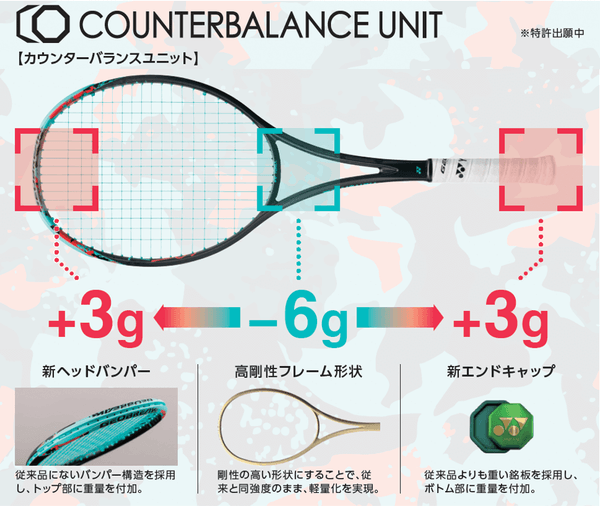 本製品は新設計「カウンターバランスユニット」(特許出願中)を採用しています。フレームの重量を削減し、フレームトップ・エンドキャップの重量を増加させることで、全体の重量・バランスを変えずにスウィングウェイトを増加。操作性はそのままに打球時のパワーを向上させました。
