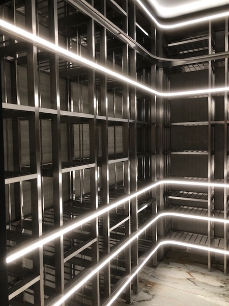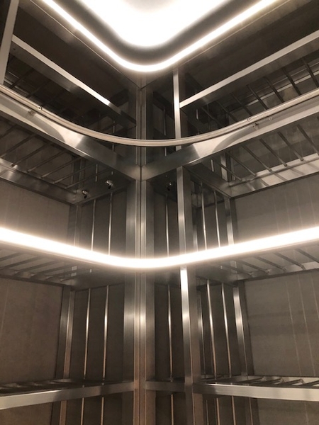 ステンレスの硬質感を否定した滑らかな印象をライン照明と間接照明で演出。